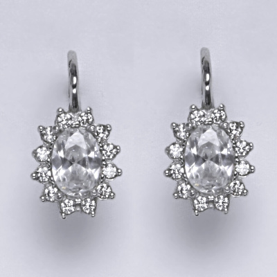 Zlaté náušnice s čirým zirkonem o rozměru 7x5 mm a malými čirými zirkony. Materiál je bílé zlato 585/1000. Celková výška náušnice je 18 mm. Zapínání náušnic je na patent. Orientační váha náušnic je 3,40 g.