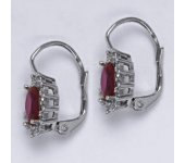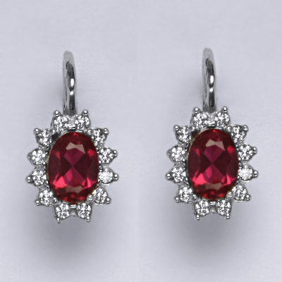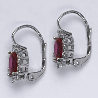 Zlaté náušnice se syntetickým rubínem a malými čirými zirkony. Velikost rubínu je 7x5 mm. Materiál je bílé zlato 585/1000. Celková výška náušnice je 18 mm. Zapínání náušnic je na patent. Orientační váha náušnice 3,40 g.