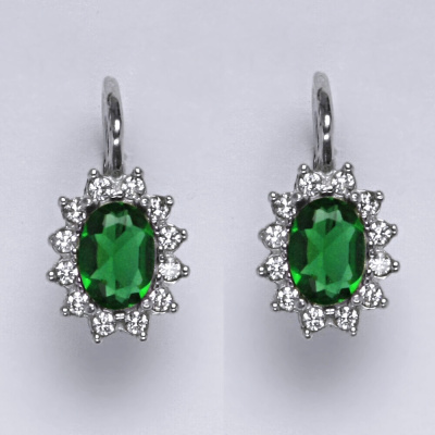 Zlaté náušnice se syntetickým smaragdem a malými čirými zirkony. Velikost smaragdu je 7x5 mm. Materiál je bílé zlato 585/1000. Celková výška náušnice je 18 mm. Zapínání náušnic je na patent. Orientační váha náušnice 3,40 g..