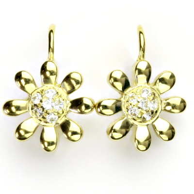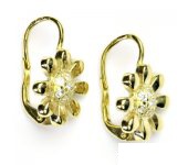 Náušnice ze žlutého zlata ve tvaru kytičky jsou zdobeny čirými zirkony o průměru 1,75 mm. Materiál je zlato 585/1000. Orientační váha náušnic je 3,92 g. Celková výška náušnice je 19 mm. Šířka náušnice je 14 mm. Náušnice mají zapínání na klapku.
