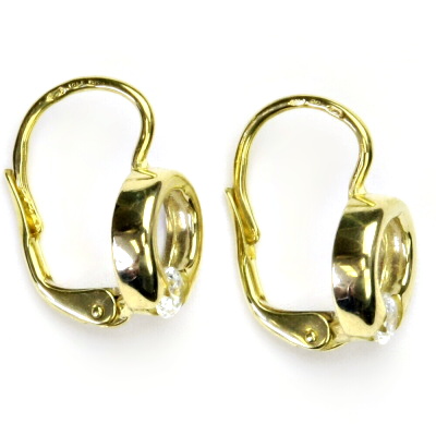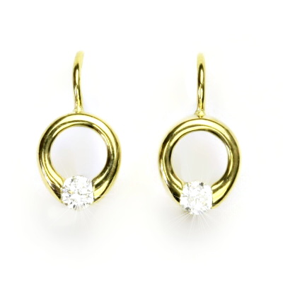 Náušnice ze žlutého zlata jsou zdobeny čirým zirkonem o průměru 3,5 mm. Materiál je zlato 585/1000. Orientační váha náušnic je 2,55 g. Celková výška náušnice je 17 mm. Šířka náušnice je 9 mm. Náušnice mají zapínání na klapku.