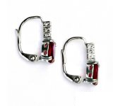 Náušnice z bílého zlata jsou zdobeny malými čirými zirkony a zirkonem v barvě rubínu o rozměru 8x6 mm. Celková výška náušnice je 16 mm. Náušnice mají zapínání na klapku. Materiál je zlato 585/1000. Orientační váha je 2,6 g.