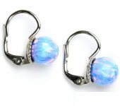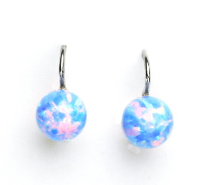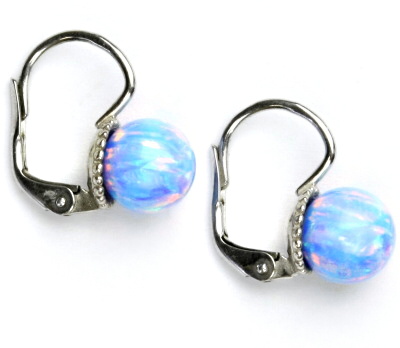 Náušnice z bílého zlata jsou zdobeny syntetickým světle modrým opálem - kulička o průměru 8 mm. Materiál je zlato 585/1000. Orietnační váha náušnic je 3,15 g. Celková výška náušnice je 15 mm. Náušnice mají zapínání na klapku a jsou rhodiované.