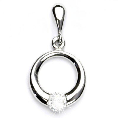 Přívěsek z bílého zlata je zdoben čirým zirkonem o průměru 4,75 mm. Materiál je zlato 585/1000. Orientační váha přívěsku je 2,54 g. Rozměr přívěsku je 22 mm včetně úchytu na výšku a 14 mm na šířku.