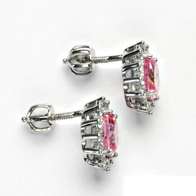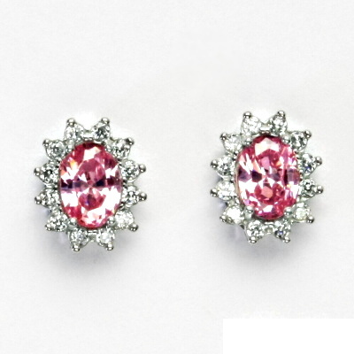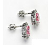 Náušnice z bílého zlata jsou zdobeny malými čirými zirkony a růžovým zirkonem 7x5 mm. Materiál je zlato 585/1000. Rozměr náušnice je 11x10 mm. Náušnice mají zapínání na šroubek. Orientační váha náušnic je 3,1 g.