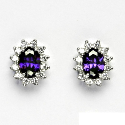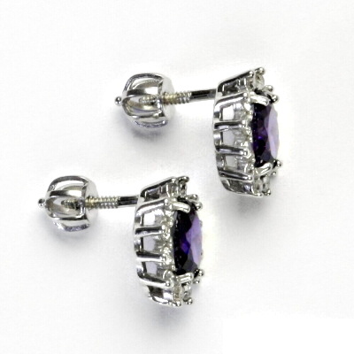 Náušnice z bílého zlata jsou zdobeny malými čirými zirkony a zirkonem v barvě ametystu 7x5 mm. Materiál je zlato 585/1000. Rozměr náušnice je 11x10 mm. Náušnice mají zapínání na šroubek. Orientační váha náušnic je 3,1 g.