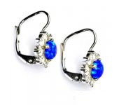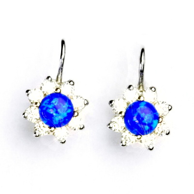 Náušnice z bílého zlata, ve tvaru kytičky, jsou zdobeny čirými zirkony a syntetickým tmavě modrým opálem o průměru 5,5 mm. Materiál je zlato 585/1000. Celková výška náušice je 16,5 mm a rozměr kytičky je 11x11 mm.
