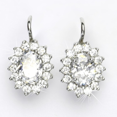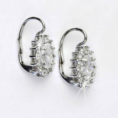 Náušnice z bílého zlata jsou zdobeny čirými zirkony, největší o rozměru 8x6 mm. Materiál náušnic je zlato 585/1000. Celková rozměr náušnice na výšku je 20 mm a 11,5 mm na šířku. Orientační váha náušnic je 3,9 g.