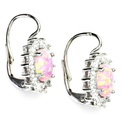 Náušnice z bílého zlata jsou zdobeny čirými zirkony a růžovým syntetickým opálem o rozměru 8x6 mm. Materiál náušnic je zlato 585/1000. Celková rozměr náušnice na výšku je 20 mm a 11,5 mm na šířku. Orientační váha náušnic je 3,9 g.