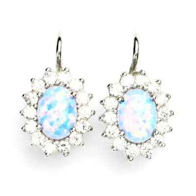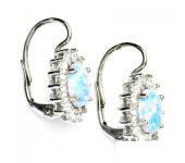 Náušnice z bílého zlata jsou zdobeny čirými zirkony a světle modrým syntetickým opálem o rozměru 8x6 mm. Materiál náušnic je zlato 585/1000. Celková rozměr náušnice na výšku je 20 mm a 11,5 mm na šířku. Orientační váha náušnic je 3,9 g.