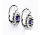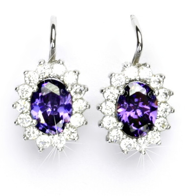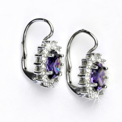 Náušnice z bílého zlata jsou zdobeny čirými zirkony a zirkonem v barvě ametystu o rozměru 8x6 mm. Materiál náušnic je zlato 585/1000. Celková rozměr náušnice na výšku je 20 mm a 11,5 mm na šířku. Orientační váha náušnic je 3,9 g.