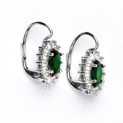 Náušnice z bílého zlata jsou zdobeny čirými zirkony a zirkonem emerald o rozměru 8x6 mm. Materiál náušnic je zlato 585/1000. Celková rozměr náušnice na výšku je 20 mm a 11,5 mm na šířku. Orientační váha náušnic je 3,9 g.
