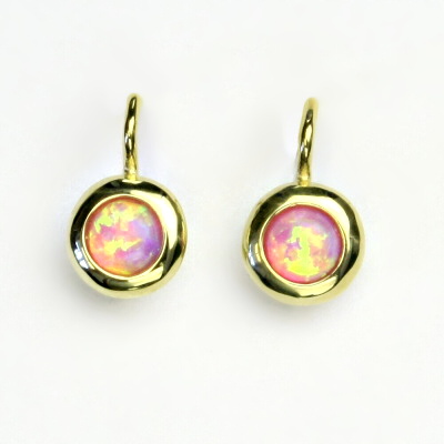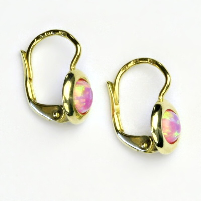 Náušnice ze žlutého zlata jsou zdobeny růžovým syntetickým opálem o průměru 5 mm. Materiál je zlato 585/1000. Orientační váha náušnic je 2,17 g. Celková výška náušnice je 15 mm.