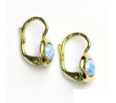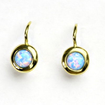 Náušnice ze žlutého zlata jsou zdobeny světle modrým syntetickým opálem o průměru 5 mm. Materiál je zlato 585/1000. Orientační váha náušnic je 2,17 g. Celková výška náušnice je 15 mm.