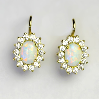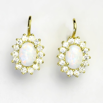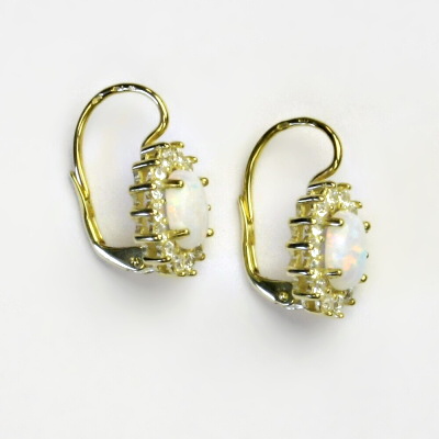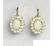 Náušnice z bílého zlata jsou zdobeny čirými zirkony a bílým syntetickým opálem o rozměru 8x6 mm. Materiál náušnic je zlato 585/1000. Celková rozměr náušnice na výšku je 20 mm a 11,5 mm na šířku. Orientační váha náušnic je 3,9 g.