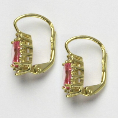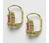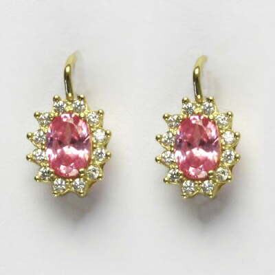 Náušnice jsou vyrobeny ze žlutého zlata. Jsou zdobeny růžovými zrikony o rozměru 7x5 mm a malými čirými zirkony. Materiál je zlato 585/1000. Orientační váha náušnice 3,40 g.