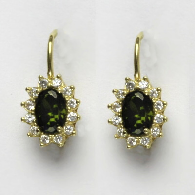 Náušnice jsou vyrobeny ze žlutého zlata. Jsou zdobeny syntetickými olivíny o rozměru 7x5 mm a malými čirými zirkony. Materiál je zlato 585/1000. Orientační váha náušnice 3,40 g.