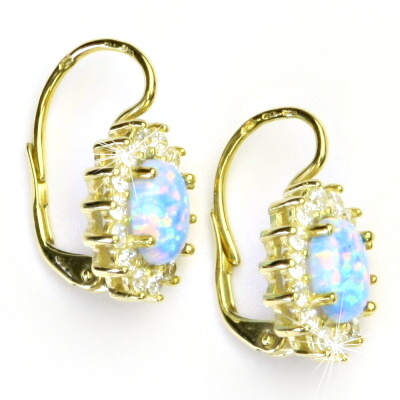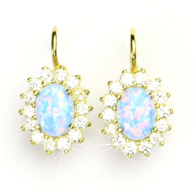 Náušnice z bílého zlata jsou zdobeny čirými zirkony a světle modrým syntetickým opálem o rozměru 8x6 mm. Materiál náušnic je zlato 585/1000. Celková rozměr náušnice na výšku je 20 mm a 11,5 mm na šířku. Orientační váha náušnic je 3,9 g.
