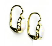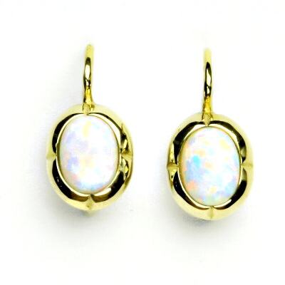 Náušnice ze žlutého zlata jsou zdobeny bílým syntetickým opálem o rozměru 8x6 mm. Materiál je zlato 585/1000. Orientační váha náušnice je 3,04 g. Celková výška náušnice je 16 mm.