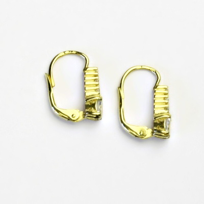 Náušnice ze žlutého zlata jsou zdobeny čirými zirkony, největší má rozměr 5x3 mm. Materiál je zlato 585/1000. Orientační váha náušnic je 2,29 g. Náušnice mají zapínání na klapku.Celková výšková výška náušnice je 16 mm.