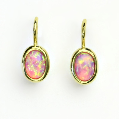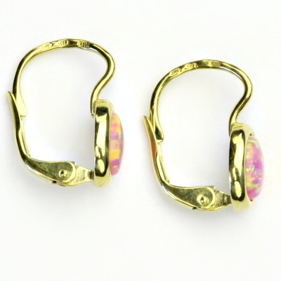 Náušnice ze žlutého zlata jsou zdobeny růžovým syntetickým opálem o rozměru 7x5 mm. Materiál je zlato 585/1000. Orientační váha náušnic je 2,79 g. Náušnice mají zapínání na klapku. Celková výška náunice je 17 mm.