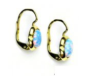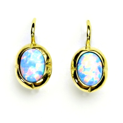 Náušnice ze žlutého zlata jsou zdobeny světle modrým syntetickým opálem o rozměru 8x6 mm. Materiál je zlato 585/1000. Orientační váha náušnice je 3,04 g. Celková výška náušnice je 16 mm.