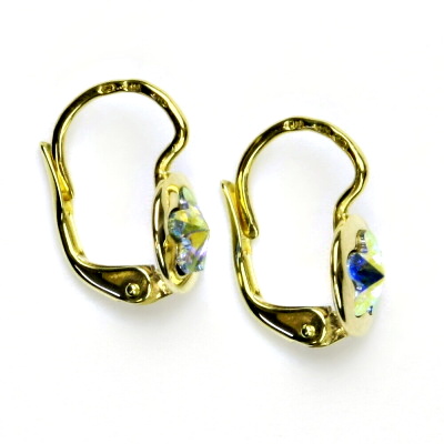 Náušnice ze žlutého zlata jsou zdobeny Swarovski krytalem ve tvaru kytičky. Barva krystalu je AB. Materiál je zlato 585/1000. Celková výška nášnice je 15 mm. Průměr zdobné části je 8 mm. Náušnice mají zapínání na klapku.