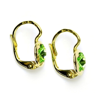 Náušnice ze žlutého zlata jsou zdobeny Swarovski krytalem ve tvaru kytičky. Barva krystalu je chryzolit. Materiál je zlato 585/1000. Celková výška nášnice je 15 mm. Průměr zdobné části je 8 mm. Náušnice mají zapínání na klapku.