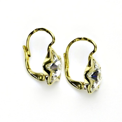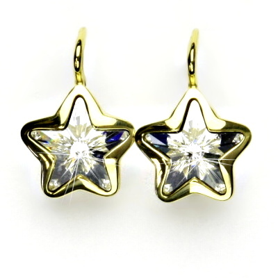 Náušnice ze žlutého zlata, ve taru hvězdičky, jsou zdobeny Swarovski krystaly - barva čirá. Náušnice mají zapínání na klapku. Materiál je zlato 585/1000. Rozměr zdobné části náušnice je 12x12 mm. Celková výška náušnice je 17,5 mm.