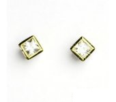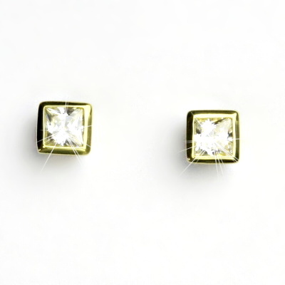Náušnice ze žlutého zlata jsou zdobeny čirými zirkony o rozměru 4x4 mm. Materiál náušnic je zlato 585/1000. Náušnice mají zapínání na šroubek. Orientační váha náušnic je 1,93 g.