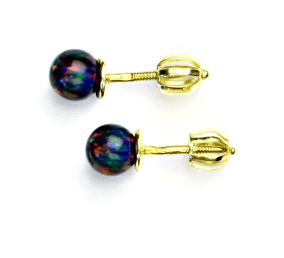 Náušnice ze žlutého zlata jsou zdobeny černým syntetickým opálem ve tvaru kuličky o průměru 6 mm. Materiál je zlato 585/1000. Náušnice mají zapínání na šroubek. Orientační váha náušnic je 1,30 g.