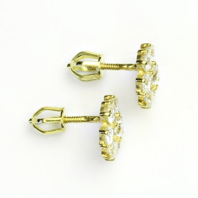Náušnice ze žlutého zlata jsou zdobeny čirými zirkony. Náušnice mají tvar kytičky a zapínání na šroubek. Materiál je zlato 585/1000. Rozměr kytičky je 10x10 mm. Orientační váha náušnic je 2,14 g.