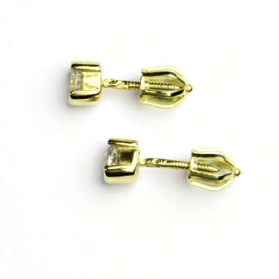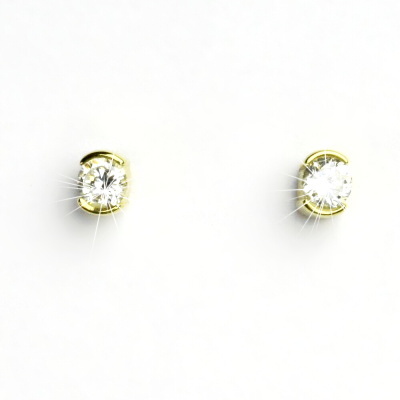 Náušnice ze žlutého zlata jsou zdobeny čirými zirkony o průměru 3,75 mm. Materiál je zlato 585/1000. Náušnice mají zapínání na šroubek. Orientační váha náušnic je 1,32 g.