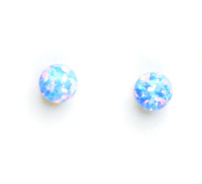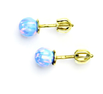 Náušnice ze žlutého zlata jsou zdobeny světle modrým syntetickým opálem ve tvaru kuličky o průměru 6 mm. Materiál je zlato 585/1000. Náušnice mají zapínání na šroubek. Orientační váha náušnic je 1,30 g.