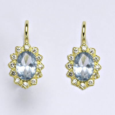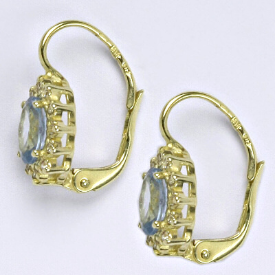 Zlaté náušnice ze žlutého zlata se syntetickým akvamarínem. Velikost zirkonu je 7 x 5 mm. Náušnice mají zapínání na klapku. Celková výška náušnice je 18 mm. Materiál je zlato 14 karátů 585/1000. Orientační váha je 3,4 g.