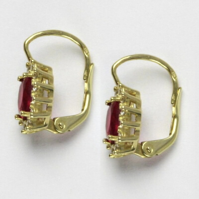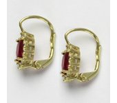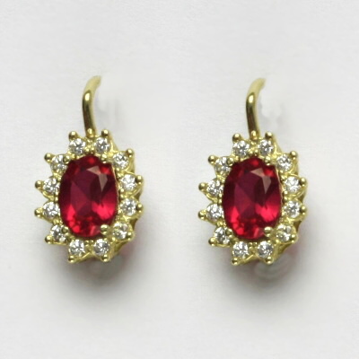 Náušnice jsou vyrobeny ze žlutého zlata. Jsou zdobeny syntetickými rubíny o rozměru 7x5 mm a malými čirými zirkony. Materiál je zlato 585/1000. Orientační váha náušnice 3,40 g.