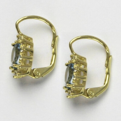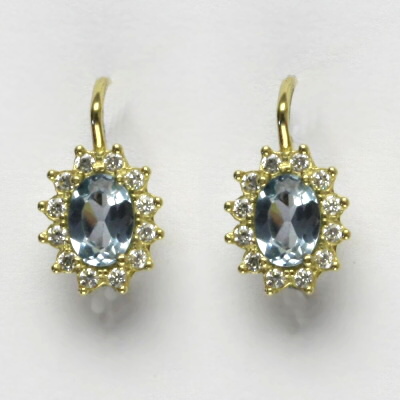 Náušnice jsou vyrobeny ze žlutého zlata. Jsou zdobeny syntetickými akvamariny světlými o rozměru 7x5 mm a malými čirými zirkony. Materiál je zlato 585/1000. Orientační váha náušnice 3,40 g.