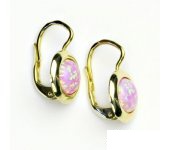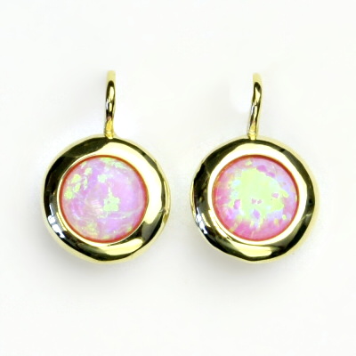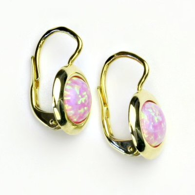 Náušnice ze žlutého zlata jsou zdobeny růžovým syntetickým opálem o průměru 7 mm. Materiál je zlato 585/1000. Orientační váha náušnic je 2,78 g. Celková výška náušnice je 17 mm.