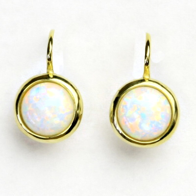 Náušnice ze žlutého zlata jsou zdobeny bílým syntetickým opálem o průměru 8 mm. Materiál je zlato 585/1000. Orientační váha náušnic je 2,96 g. Celková výška náušnice je 18 mm.