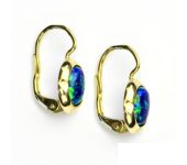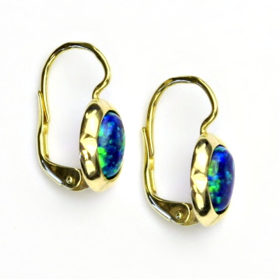 Náušnice ze žlutého zlata jsou zdobeny zeleným syntetickým opálem o rozměru 8x6 mm. Materiál je zlato 585/1000. Orientační váha náušnice je 3,04 g. Celková výška náušnice je 16 mm.