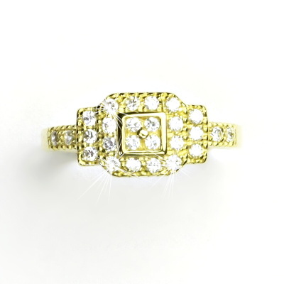 Prstýnek ze žlutého zlata je zdoben čirými zirkony. Materiál je zlato 585/1000. Orientační váha prstenu ve velikosti 53 je 4,07 g. Rozměr zdobné části prstenu je 19x8 mm.