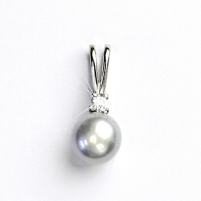 Zlatý přívěšek z bílého zlata s šedou (stříbrnou) přírodní říční perlou. Průměr perly je 8 mm. Celková výška přívěsku je 18 mm. Materiál je zlato 585/1000. Přívěsek má povrchovou úpravu čisté rhodium. Orientační váha přívěsku je 1,45 g.
