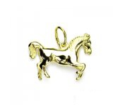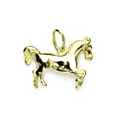 Přívěsek ze žlutého zlata ve tvaru koně. Materiál je zlato 585/1000. Orientační váha přívěsku je 2,33 g. Rozměr přívěsku je 14 mm včetně očka na výšku a 17 mm na šířku.