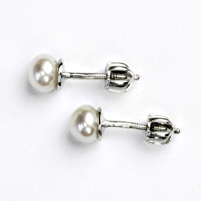 Náušnice z bílého zlata jsou zdobeny bílou přírodní říční perlou o průměru 5,5 - 6 mm. Materiál je zlato 585/1000. Náušnice mají zapínání na šroubek. Orientační váha náušnic je 1,2 g.