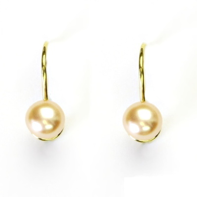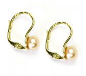 Zlaté náušnice jsou zdobeny lososovou přírodní říční perlou. Průměr perly je 6-6,5 mm. Náušnice jsou ze žlutého zlata a mají zapínání na klapku. Materiál náušnic je zlato 585/1000. Celková výška náušnice je 15 mm. Orientační váha náušnic je cca 2