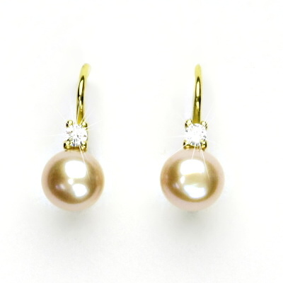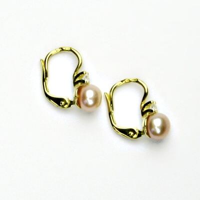 Náušnice ze žlutého zlata s malým čirým zirkonem a přírodní růžovou perlou o průměru 5,5 mm. Materiál je zlato 585/1000. Náušnice mají zapínání na klapku. Celková výška náušnice je 14 mm.