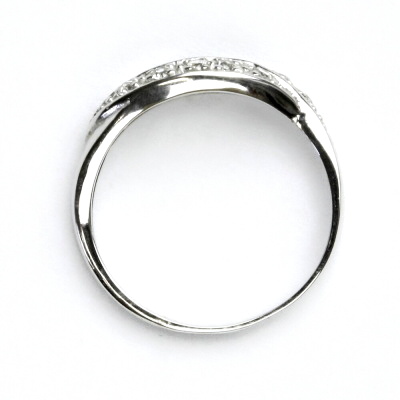 Prstýnek z bílého zlata je zdoben čirými zirkony. Materiál je zlato 585/1000. Orientační váha prstýnku je ve velikosti 54 2,52 g. Rozměr zdobné části prstenu je 18x7 mm.