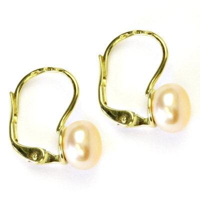 Zlaté náušnice jsou zdobeny lososovou přírodní říční perlou. Průměr perly je 7-7,5 mm. Náušnice jsou ze žlutého zlata a mají zapínání na klapku. Materiál náušnic je zlato 585/1000. Celková výška náušnice je 15 mm. Orientační váha náušnic je cca 2,50 g.