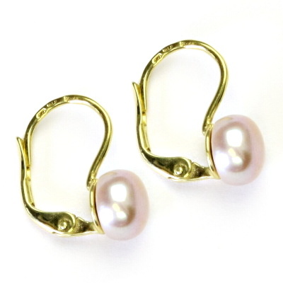 Zlaté náušnice jsou zdobeny růžovou přírodní říční perlou. Průměr perly je 7-7,5 mm. Náušnice jsou ze žlutého zlata a mají zapínání na klapku. Materiál náušnic je zlato 585/1000. Celková výška náušnice je 15 mm. Orientační váha náušnic je cca 2,50 g.&a