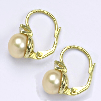 Zlaté náušnice ze žlutého zlata s přírodní říční perlou a čirým zirkonem. Velikost perly je 8 mm. Celková výška náušnice je 17 mm. Náušnice mají klasické zapínání na patent. Materiál je žluté zlato 14 karátů 585/1000.
